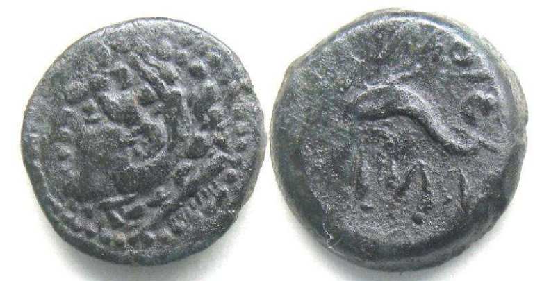 Burgos 1333 | Gades, Spain, AE13. 1.99 gr. Bearded head facing / Two tunny fish swimming left. Burgos 1333; Mionnet I, 107. | Text | Image |