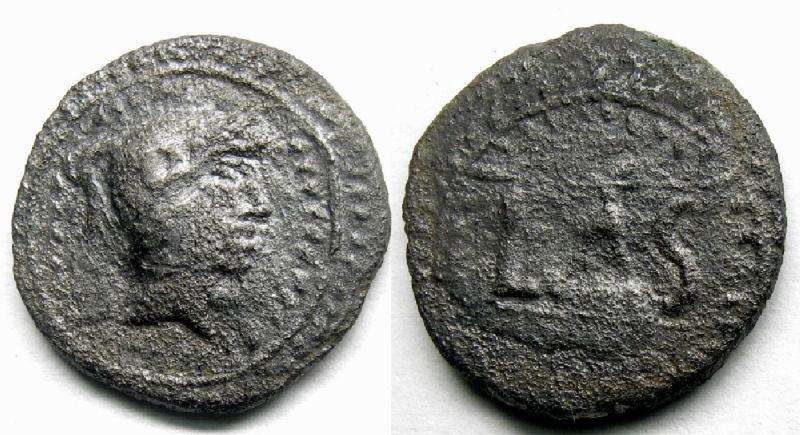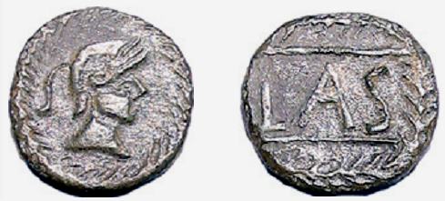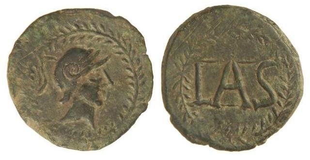 | SNG Cop 165 | Lastigi, Spain, 2nd. century BC. AE Quadrans. 5 gr. Helmeted, male head right in wreath / LAS within wreath. Heiss 4; SNG Cop 165; Burgos 1680. | Text | Image |