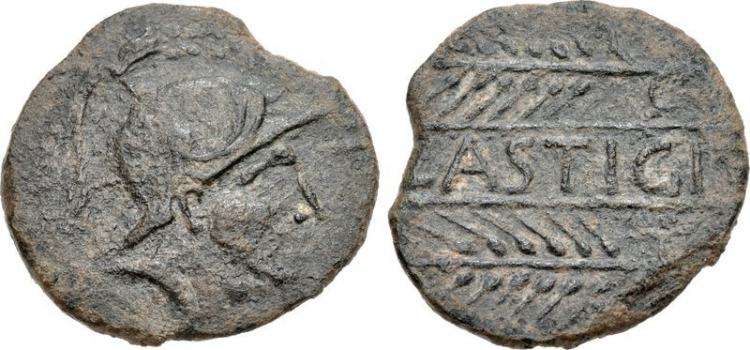 | SNG BM 1567 | Lastigi, Spain, ca 150-100 BC. AE Half Unit (Semis), 25mm, 6.25 g. Helmeted male head right / LASTIGI between grain ear left above and below. CNH 3; SNG BM Spain 1567. | Text | Image |