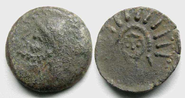 | Villaronga 11v | Spain, Malaca. c2nd Century BC. AE 22mm. Head of Chusor-Ptah (Hephaistos) right, wearing pointed cap, tongs behind / radiate head of Sol facing. | Text | ![]() |
