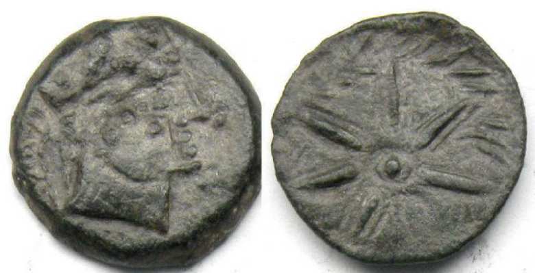 | Villaronga 27 | Malaca (Malaga), Spain, AE19 Semis. 5.84 g. Head of Hephaistos (Vulcan) left, wearing cap; tongs behind head, Pnoenician legend to left / Eight-rayed star, dot in centre, all within wreath. Villaronga 27 type. Not in Burgos. | Text | ![]() |