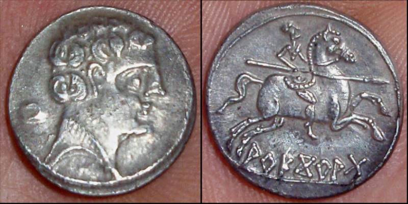 | Mionnet 413 | Numantia, Hispania Citerior, Spain. AR denarius, 3.7 gr, 19mm, King Arekorata, ca. 200 BC. Bare-headed male bust right, wearing pearl necklace, Θ behind head / Warrior on horseback right, holding spear, AREKARATA in Celtiberian below. CNH 26; Mionnet I 413. | Text | Image |