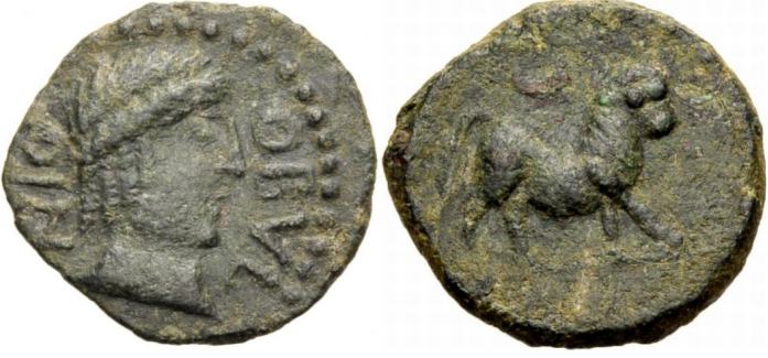 | Burgos 852 | Spain, AE Semis, 1st century BC. Obulco-Ibolka (Porcuna/Jaen), 6,91 g. OBVL-NIC, laureate head of Apollo right / Bull standing right, crescent above. CNH 80; Heiss 27; Burgos 852. | Text | Image |