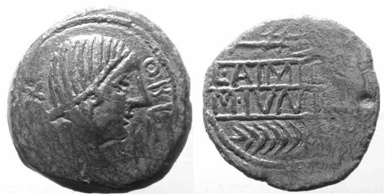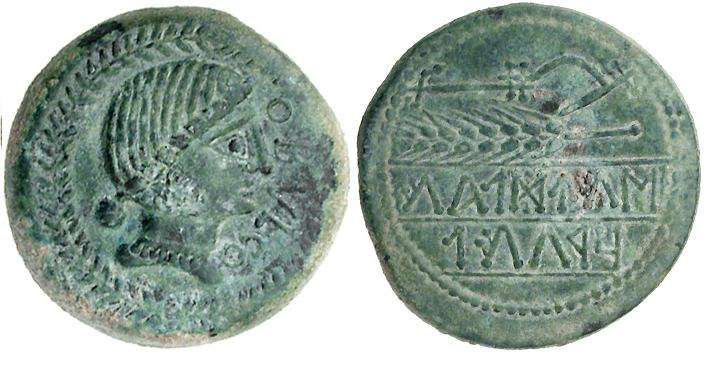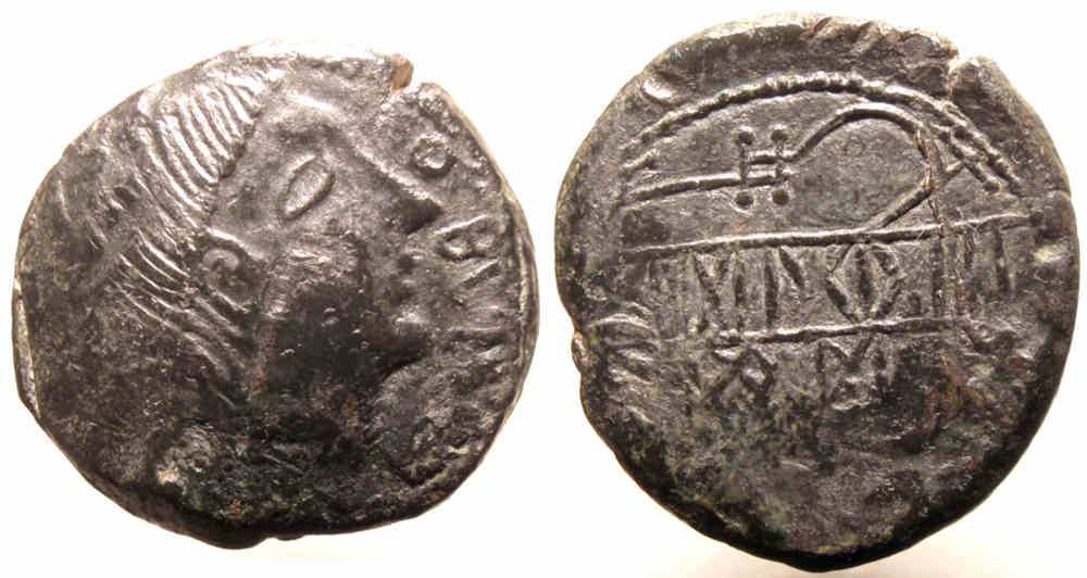 | Burgos 1395 | Obulco. Ca 150 BC. AE As. OBVLCO, diademed head right, CX behind / L. AIMIL/M.IVNI in two lines across field; plow left above; grain ear and X below; AID vertically to right. Villaronga 16. | Text | Image |