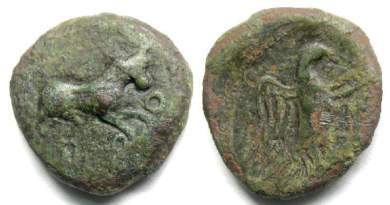 | Burgos 1850 | Obulco, Spain, AE Semis 8,71 gr. 22 mm. OBVLCO beneath bull running right / Eagle standing right, wings spread. Burgos (2008), 1850; SNG Cop 226. | Text | Image |