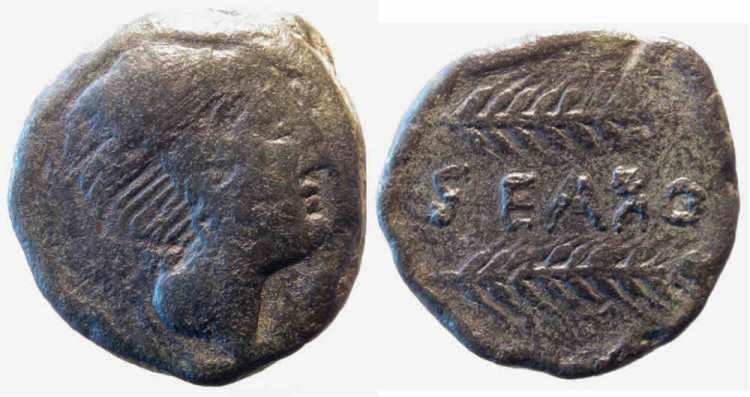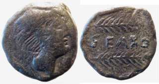 | Burgos 2112 | Searo, Seville, Spain, AE As. 25-26 mm, 16.87 gr. Rudimentary head of Herakles right, wearing lionskin headdress / SEARO between two horizontal corn-ears. Burgos (2008) 2112; Ripolles 455; Mionnet I, 188. | Text | Image |