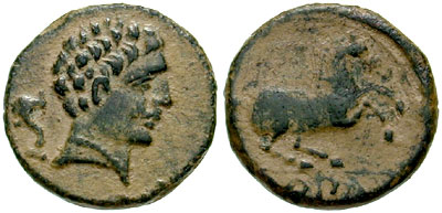 | CNH 67 | Hispania, Konterbia Karbika. After 133 BC. AE unit. Male head right with hair in tight curls and wearing pearl necklace, dolphin before, Oscan inscription AFPA behind = "ka f bi ka" / Warrior on horseback charging right with couched spear, Oscan inscription XNQIXY = "ko n te r bi a" in exergue. CNH 67. Guadán 754, SNG Cop 381. | Text | Image |