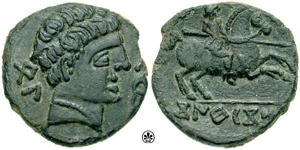 | Burgos 2176 | Segobriga, Spain. AE As. 24mm, 9.71 g. Male head right, palm branch behind head, dolphin and Iberian "S" (resembling an M) before / Iberian legend: SEKOBIRIKES beneath Iberian rider on horseback right, holding horizontal spear. Burgos (2008) 2176; Villaronga 1. | Text | Image |