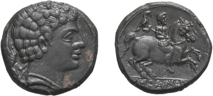 | BMC 829 | Sekaisa, Spain. AE27, 13.97 g. early 1st early BC. Male head right, lion behind head / SEKAISA (in celtiberian) beneath horseman galloping right, holding banner, eagle to left. SNG BM Spain 829. | Text | Image |