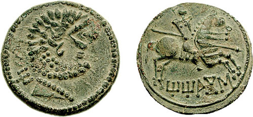 | SNGBM_1074 | Spain, Titiakos. Early 1st century BC. AE Unit. Male head right, in necklace; ti to left / Horseman right, holding spear. CNH 11. | Text | Image |