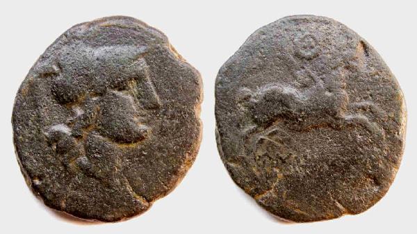 | Burgos 1210 | Untikesken Celtic-Iberian, 2nd-1st Century BC. AE As, Helmeted head of Athena right / Pegasus leaping right, wreath above, Iberian legend u-n-ti-ke-s-ke-n. Burgos 1210; SNG Cop 647. | Text | Image | |
