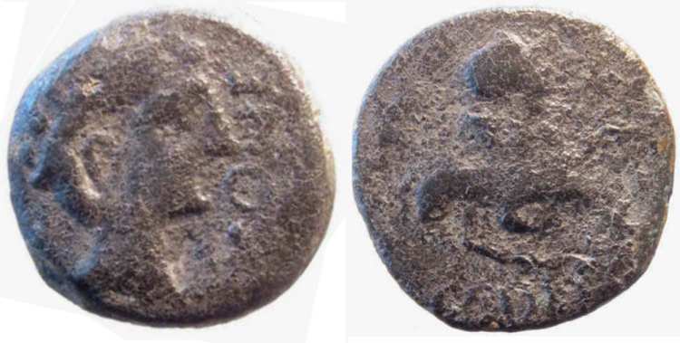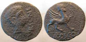 | Burgos 2499 | Urso, Spain. AE30 As. 13.07 gr. VRSONE, male head right / L.AP.DEC.Q.F., sphinx walking right, front left paw raised. Burgos (2008) 2499; Bassono Mus. 83; Mionnet Supp. 1, 270. | Text | Image |