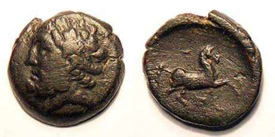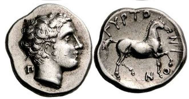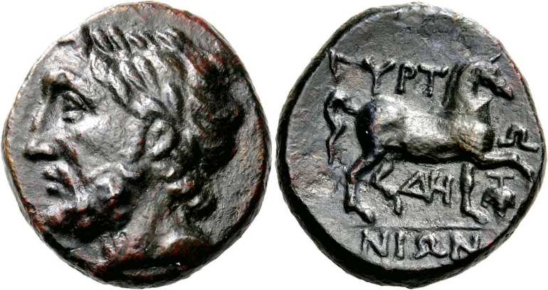 | SNG Cop 61 | Gyrton, Thessaly. Circa 4th century BC. AE20. Laureate head of Zeus left / ΓYΡTΩ-NIΩN, Bridled horse left, MP monogram below. | Text | Image |