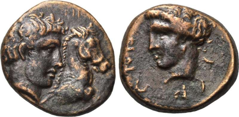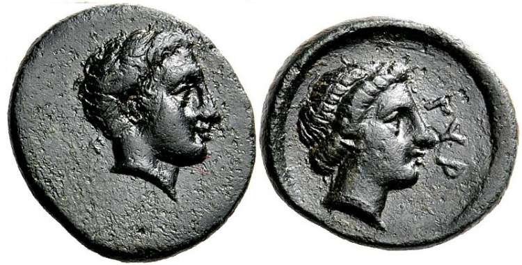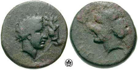 | BCD 1049 | Gyrton, Thessaly, AE16, 2.73 g. civic issue. ca. 340-330 BC. Bare head of the hero Gyrton right, Π behind head. / ΓYΡ, Head of the nymph Gyrtona right, wearing earring and necklace. BCD (Nomos IV) 1049, otherwise unpublished. | Text | Image |