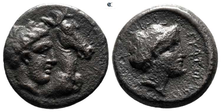 | SNG Cop 57 | Gyrton, Thessaly. Circa 400-344 BC. AE17. Youthful head of Gyrton right, beside horse's head right / Head of the Nymph Gyrtona left, hair in sphendone. Weber 2807. | Text | Image |