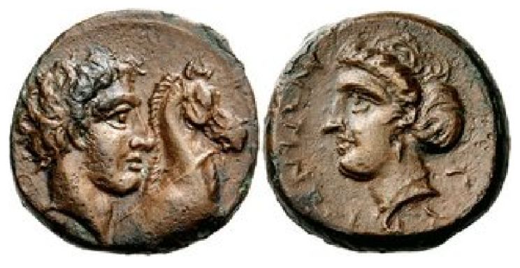 | Sear SG 2086 | Gyrton, Thessaly, AE Dichalkon, 4th century BC. 17 mm, 4.05 g. Youthful male head right, forepart of bridled horse right to right / ΓYΡTΩNION, Head of nymph left, wearing earring and pearl necklace. BCD 1052; Rogers 228.. | Text | Image |
