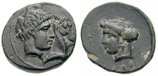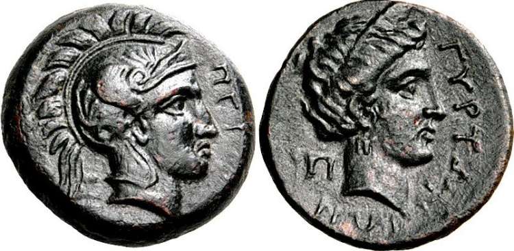 | Rogers 230 var | Gyrton, Thessaly, AE16, 4.83 g. civic issue. ca. 340-330 BC. ΠEI, Helmeted head of Ares or the hero Gyrton right. / ΓYΡTΩN-IΩN, Head of the nymph Gyrtona right, wearing earring and necklace, Π behind head. BCD (Nomos IV) 1053. Var of BMC 1a; Traité IV, 743 and Rogers 230. | Text | Image |