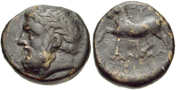 | Rogers 235 | Gyrton, Thessaly. AE19, 7.3 g. ca. 300-196 BC. Laureate head of Zeus left / GYRT-(WNIWN, horse trotting right, grain ear below. Rogers 235; SNG Cop 60. | Text | Image |