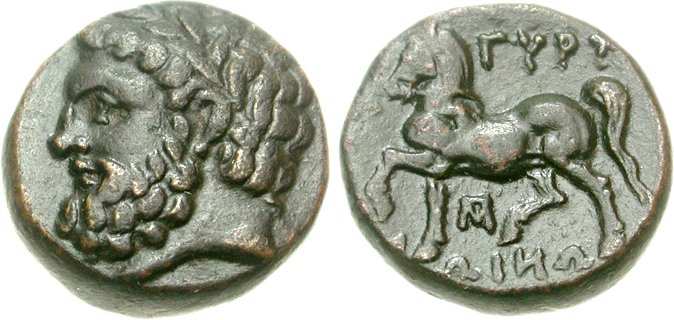 | Rogers 236 | Gyrton, Thessaly. AE18, 8.86 g. ca. 300-196 BC. Laureate head of Zeus left / ΓYΡT-Ω-NIΩN, partially retrograde, bridled horse trotting left, ΠM monogram below. Rogers 236; SNG Cop 61. | Text | Image |