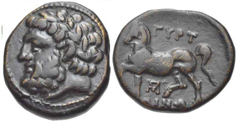 | Rogers 234 | Gyrton, Thessaly. AE19, 9.69 g. ca. 300-196 BC. Laureate head of Zeus left / ΓYΡT-Ω-NIΩN, bridled horse trotting left, ΠM monogram below. Rogers 234; SNG Cop 61. | Text | Image |