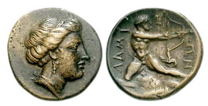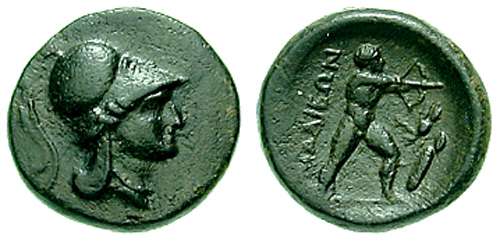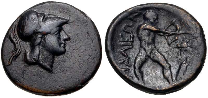 | SNGCop 88 | Thessaly, Lamia. Circa 400-344 BC. AE 13mm. Helmeted head of Athena right / Herakles or Philoktetes shooting bow right. SNG Copenhagen 87-88. | Text | Image |