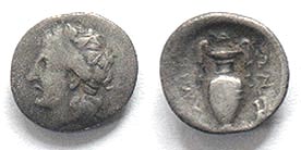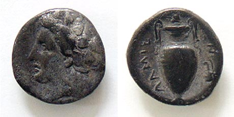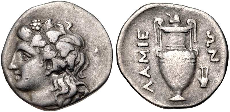 | BMC 2ff | Lamia, 400-344 BC, AR Hemidrachm. Head of young Dionysus left wreathed with ivy. / Amphora. | Text | Image |