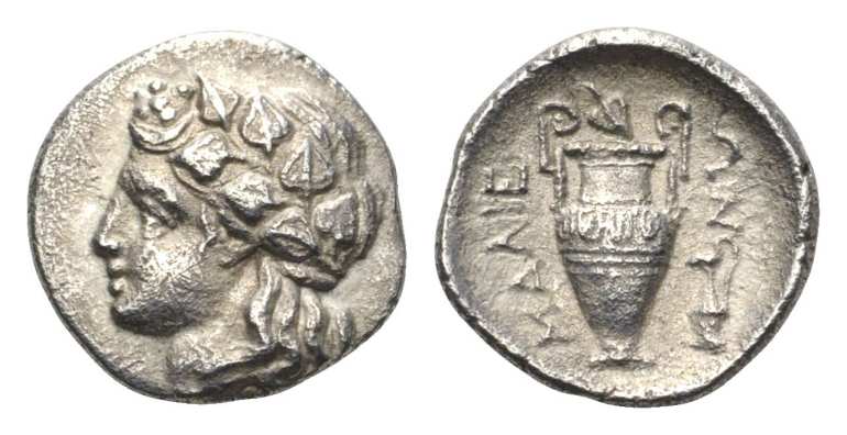 | BMC 4ff | Lamia AR Obol. 400-344 BC. Head of young Dionysus left, wreathed with ivy / Amphora. | Text | Image |