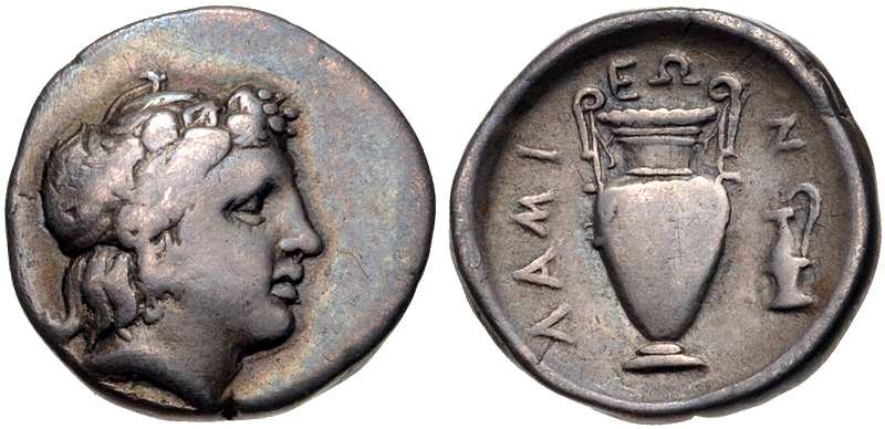 | Hoover HGC 119 | Lamia, Thessaly, ca 400-375 BC. AR Hemidrachm. 15mm, 2.81 g. Head of young Dionysos right, wreathed with ivy / ΛAMIEΩN, amphora; to right, prochous with handle to right. BCD Thessaly II 121; Hoover HGC 119. | Text | Image |