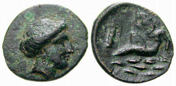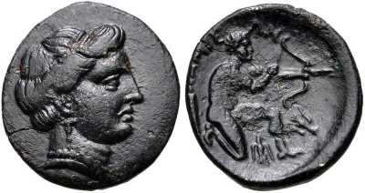 | Rogers 385 | Lamia, Thessaly, ca 400-350 BC. AE Chalkous. 15mm, 2.08 g. Head of the nymph Lamia right, wearing earring and necklace / ΛAMIEΩN, Philoktetes, wearing pileus, reclining left on rocks, raising right hand and placing left on rocks; bow and quiver to left. Rogers (Malia) 385; BCD Thessaly II 128.3. | Text | Image |