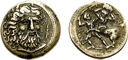 | McClean 4648 Rogers 412 | Mopsion, Thessaly. Ca 350 BC. AE 20mm. Laureate head of Zeus facing slightly right; thunderbolt to right / MOΨIATΩN, The Lapith Mopsos, standing facing & wielding club, about to strike Centaur who stands left, holding a boulder overhead. McClean 4648; Sear SG 2154; Rogers 412; BCD Thessaly 484. | Text | ![]() |