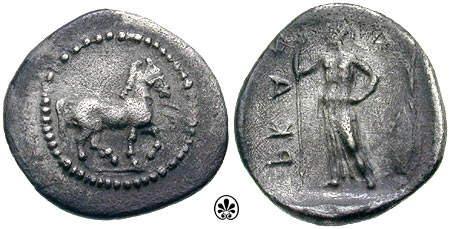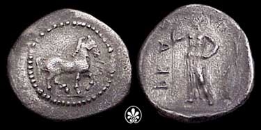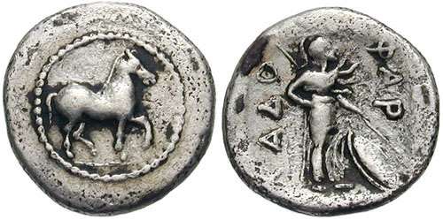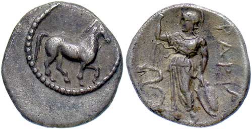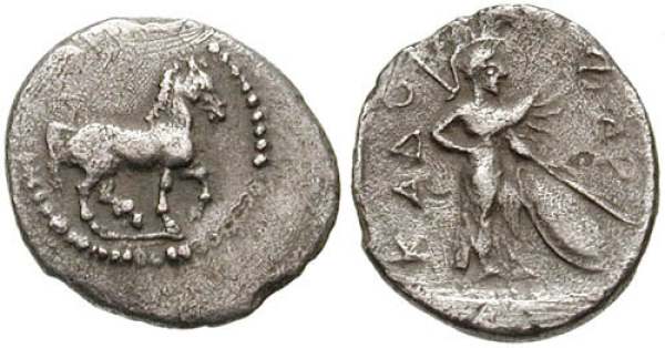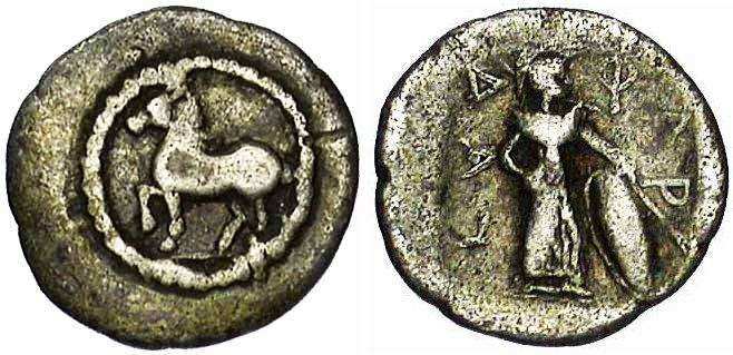 | Sear SG 2184 | Pharkadon, Thessaly, AR Obol. c 450-400 BC. Horse pacing right / ΦAΡKAΔO, Athena standing right, spear over shoulder, shield resting against her, all within incuse square. BMC 8. | Text | Image |