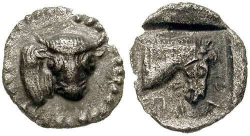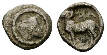 | BCD 609 | Pharkadon, Thessaly, AR Hemiobol. 8 mm, 0.34 g, late 4th to early 3rd Century BC. Head and neck of bull right within lined circle / ΦA above ram standing left; all within incuse square. BCD Thessaly 609. | Text | Image |
