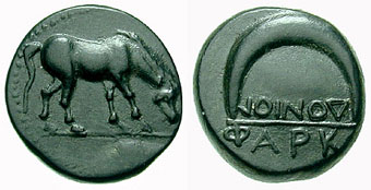 | BMC 9v | Thessaly, Pharkadon AE 16mm. Horse grazing right / ΦAΡKA-ΔONION, large crescent. | Text | Image |