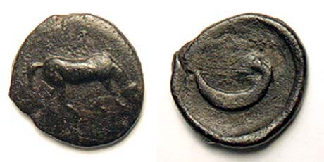 | Rogers 462 | Pharkadon, Thessaly. 400-344 BC. AE 18 mm. Horse grazing right / Crescent. | Text | Image |