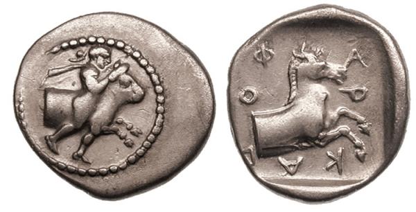 | Sear SG 2183 | Thessaly, Pharkadon AR Hemidrachm. 450-400 BC. Bull wrestler right, grasping horns of bull forepart leaping right / ΦAΡKAΔO arranged in square around forepart of horse leaping right. | Text | Image |