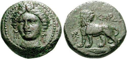 | BMC 11 | Kardia, Thrace. Ca 350-309 BC. AE 20mm, 6.60 g. Head of Persephone facing slightly left, wearing wreath of grain and triple-pendant earrings / KAΡΔIA, lion standing left, head right, on barley grain; star to left. SNG Copenhagen 866; BMC 11. | Text | Image | |