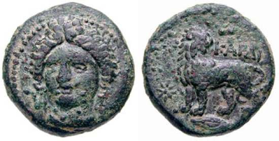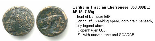 | SNG Cop 863 | Cardia, Thracian Chersonese, AE18. Head of Demeter left / lion standing left, breaking spear in its jaws, grain ear below. | Text | Image | |