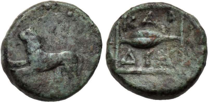 | Moushmov 5479 | Thracian Chersones, Kardia AE18. 4th century BC. Head of Persephone left, wreathed with corn ears / KAΡΔIA, lion standing left breaking spear in its mouth. | Text | Image | |