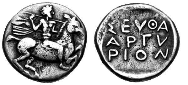 | Moushmov 5688 | Seuthes I, King of Thrace. 425-405 BC. AR Didrachm. 8.3 g, 23 mm. Horseman, naked except for chlamys flying out behind his shoulders, galloping right, wielding spear in right hand / ΣEVΘA-AΡΓV-ΡION in three lines within dotted border. Moushmov 5688; Traité II-4, 1290; Topalov 71-72. | Text | Image |