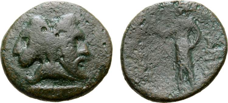 | Topalov 124 | Spartokos, Odrysian King of Thrace, AE19. Kabyle mint, ca 281-277 BC. 5.3 g. Janiform heads of lion left and bearded king right on a common base. / (BAΣIΛEΩΣ ΣΠAΡTOKOY], Artemis standing left, wearing short chiton and holding patera. Topalov Contrib. 2003, 124; Draganov, Cabyle, pl. 1, 8 (same obverse die); Hoover HGC 1476; Jurukova 106. | Text | Image |