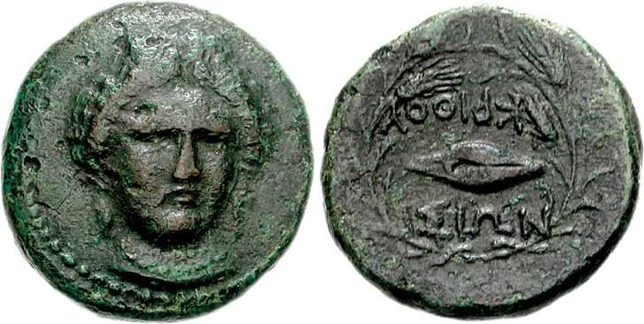 | CNG 76, 208 | Krithote, Thrace, AE20, ca. 350-281 BC. 8.08 g. Head of Demeter facing slightly right, hair in korymbos, wearing earrings and necklace. KΡIΘOY (upside down)-ΣIΩN, barley corn within wreath. CNG 76, 208. SNG Copenhagen 886 var. (head slightly left); Traité II-4 1597 var (position of legend); BMC 1 var (ditto). | Text | Image |