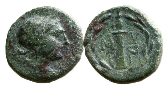 | Sallet 12 | Myrina, Lemnos, Thrace. AE18. 300 BC. 5-79 g. Head of Artemis right, quiver behind shoulder. / M-Y Ρ-I in two lines, quiver with strap on the right, all within wreath. Sallet, Berlin I, 12-13; Berlin 50/1875; CN 18922; Prokesch-Osten Myrhina 1 in NZ 4 (1872). | Text | Image |