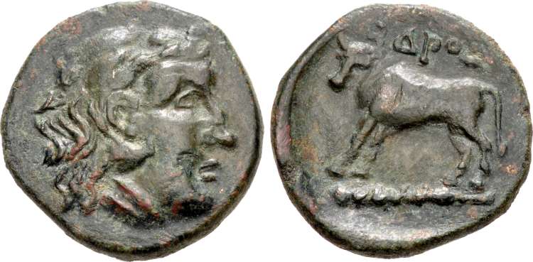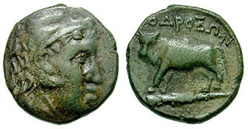 | SNG BMC 333 | Odrysae, Thrace, Black Sea Area. Ca 3rd C. BC. AE 16mm, 3.46 gm. Head of Herakles right, wearing lion's skin headdress / OΔΡOΣΩN, Bull standing left on club. SNG BMC Black Sea 333. | Text | Image |