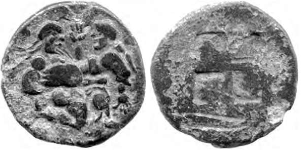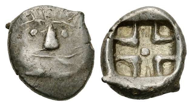 | Topalov 19 | Odrysae, Thrace, Black Sea Area. AE20, ca 3rd Century BC. 2.12 g. Copying the silver coins of Thasos. Ithyphallic satyr running right, carrying off a nymph, her raised right hand showing four fingers and a thumb. / Quadripartite incuse. Unpublished as AE. Topalov fig 19 in "Studie in honorem Iliae Prokopov, 2012". | Text | Image |
