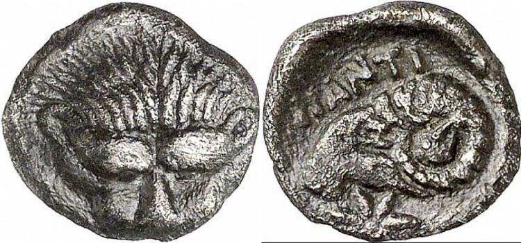 Frolova 401 | Pantikapaion, Thrace. AR obol, ca. 390-380 BC. Lion's scalp seen from front / ΠANTI, ram's head left, star below. MacDonald, Bosporus 28 var; Frolova, Bosporos 401var. | Text | ![]() |