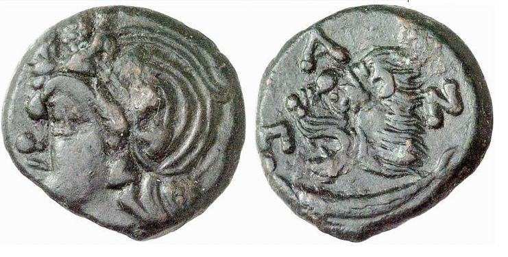 SNG BM 890.1 | Pantikapaion, Thrace. Circa 4th-3rd Century BC. AE 17mm. Head of bearded Pan left / Bull head left. | Text | ![]() |