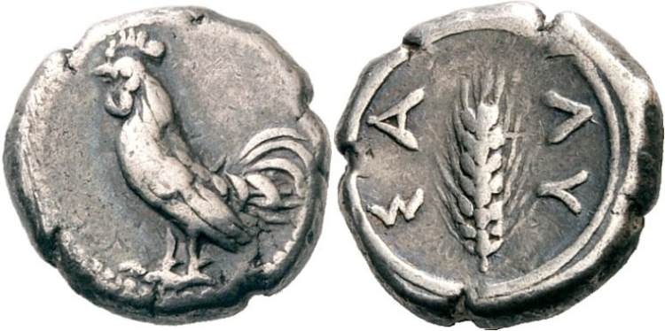 | SNG Tubingen_910 | Selymbria, Thrace AR Hemidrachm. Ca 425-410 BC. Rooster standing left with worm in its beak / Σ-E Λ-Y, grain ear. | Text | Image |