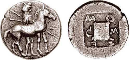 | Moushmov 6155 | Bisalti, Thraco-Macedonian Tribe, AR Octadrachm. 475-465 BC, C-IΣAΛT-IK-Ω-N, Naked male hunter, holding two spears, standing right on far side of bridled horse right. / Shallow quadripartite incuse square, small raised square at centre. | Text | Image |