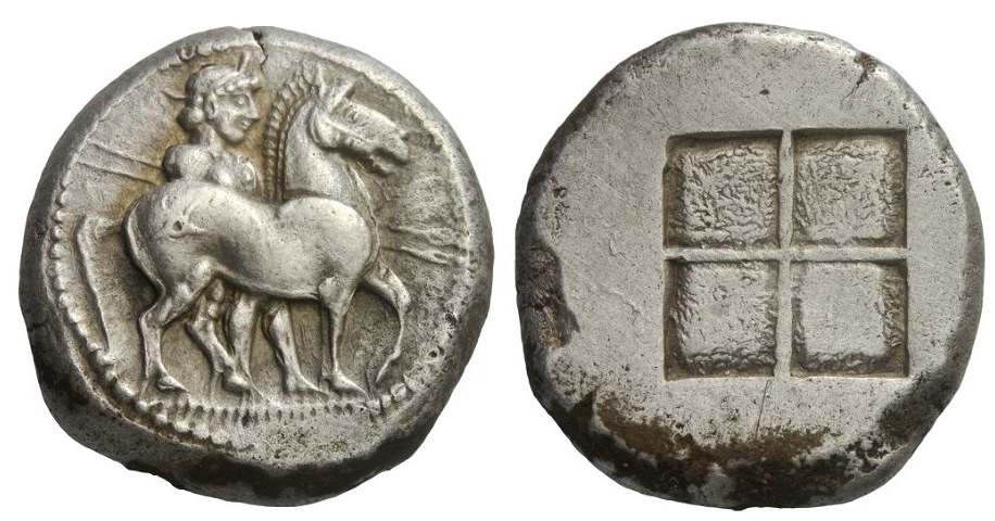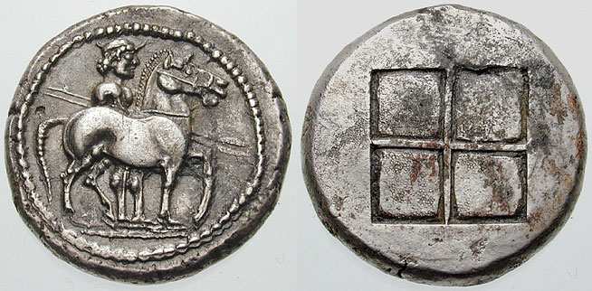 | Svoronos 16 | Thraco-Macedonian Tribes, The Bisalti. Circa 480 BC. AR Oktadrachm. Bridled horse walking right; behind is a young man in a petasos holding two spears pointed forward / Quadripartite incuse. SNG Ashmolean 2242; Raymond pl. 2, 5.