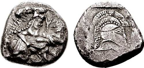| Asyut_93 | Thraco-Macedonian Tribes, The Orreskioi AR Stater. ca 500-480 BC. Centaur carrying nymph right / Helmet right in incuse square. AMNG III/2, 18, Asyut 93.
